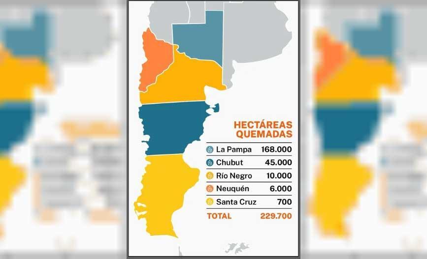 Relevaron que en ese período se quemaron más de 168.000 hectáreas en La Pampa, 45.000 en Chubut, 6000 en Neuquén, además de 10.000 en Río Negro y 700 en Santa Cruz, lo que eleva el total regional a casi 230.000 hectáreas afectadas.