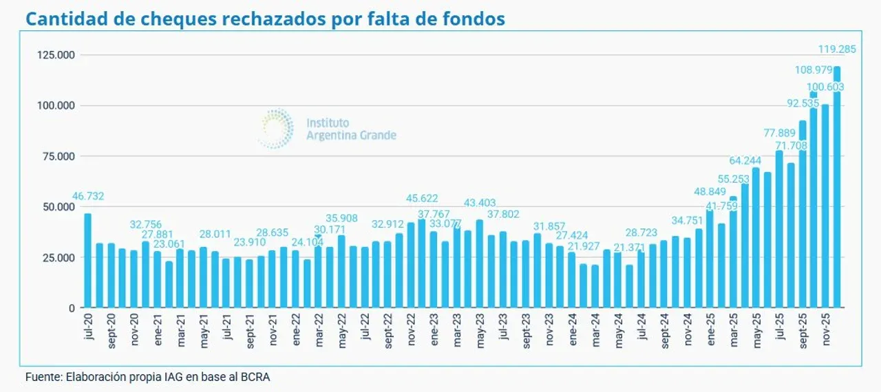La velocidad del deterioro financiero es el dato que más preocupa a los analistas. Según el documento, la cantidad de cheques sin fondos "se triplicó en un año", marcando un aumento del 200% respecto a las cifras de diciembre de 2024.