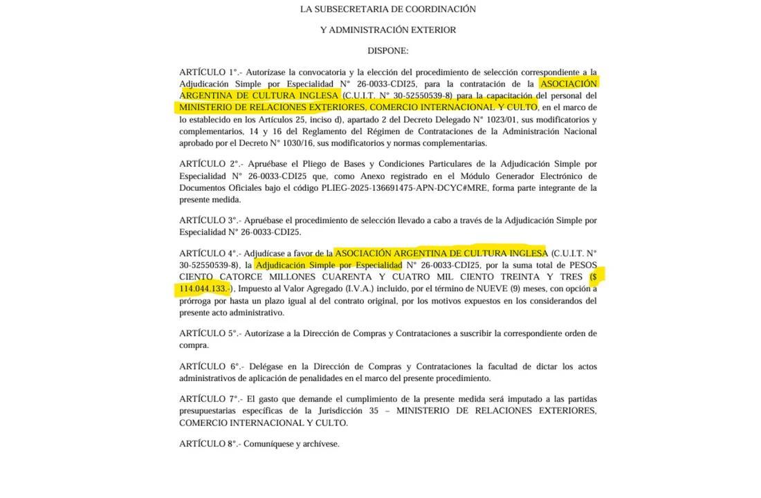 El Ministerio de Relaciones Exteriores, Comercio Internacional y Culto adjudicó un contrato por $114.044.133 (IVA incluido), cerca de USD 78.000 al tipo de cambio actual, para la capacitación en idioma inglés de su personal a la Asociación Argentina de Cultura Inglesa (AACI).