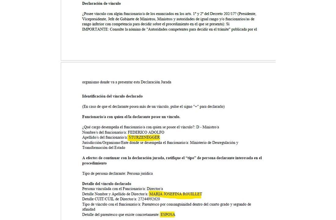 En los considerandos de la disposición, Cancillería dejó constancia de que, al analizar la Declaración Jurada de Intereses exigida por el Decreto 202/2017, surgió un "vínculo positivo" entre una autoridad de la entidad adjudicataria y un ministro nacional. La Oficina Anticorrupción incorporó un dictamen en el expediente que encuadró el vínculo como "familiar (matrimonio)" entre Sturzenegger y Rouillet.