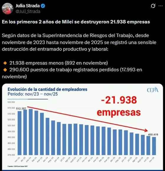 "Según datos de la Superintendencia de Riesgos del Trabajo, desde noviembre de 2023 hasta noviembre de 2025 se registró una sensible destrucción del entramado productivo y laboral" comenzó escribiendo en su cuenta de X la diputada y presidenta del Centro de Economía Política Argentina (CEPA).