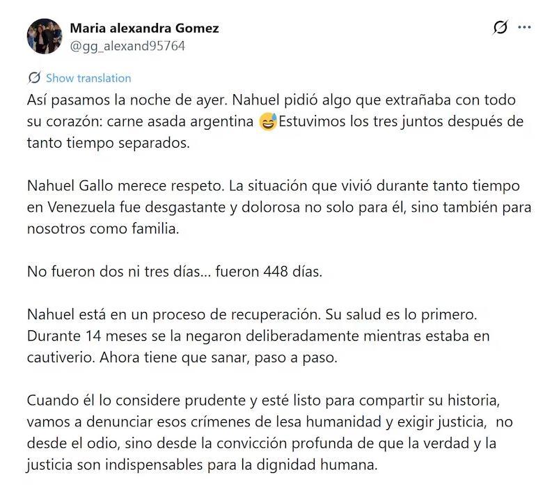 "Nahuel Gallo merece respeto. La situación que vivió durante tanto tiempo en Venezuela fue desgastante y dolorosa no solo para él, sino también para nosotros como familia. No fueron dos ni tres días fueron 448 días. Nahuel está en un proceso de recuperación. Su salud es lo primero. Durante 14 meses se la negaron deliberadamente mientras estaba en cautiverio. Ahora tiene que sanar, paso a paso", explicó.