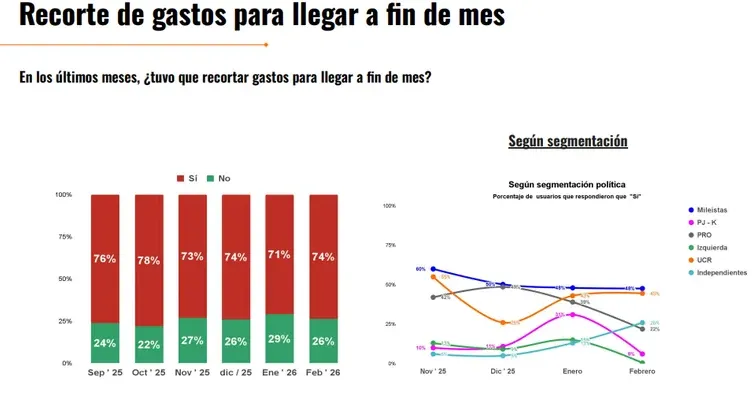 Llegar a fin de mes: El 68% de los argentinos declara que sus ingresos no le alcanzan o solo le alcanzan "parcialmente" para cubrir el mes. Esto se traduce en un dato contundente: el 74% de la población tuvo que recortar gastos en el último año.
