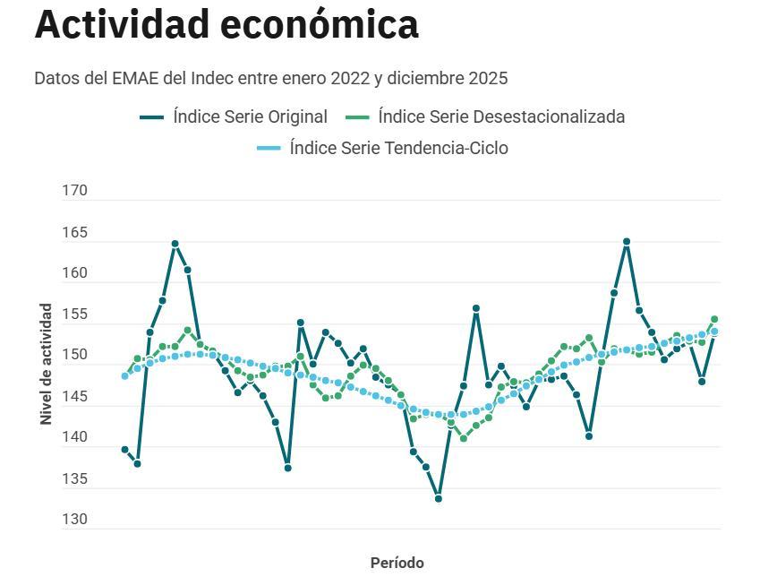 "La caída mensual del EMAE agregado se explica fundamentalmente por el agro: tras la cosecha récord de trigo (que incide significativamente más en diciembre que en enero), la producción agropecuaria cayó 8% mensual sin estacionalidad. La serie desestacionalizada del EMAE sin agro se mantuvo estable frente a dic-25 (0%)", destacaron los analistas.
