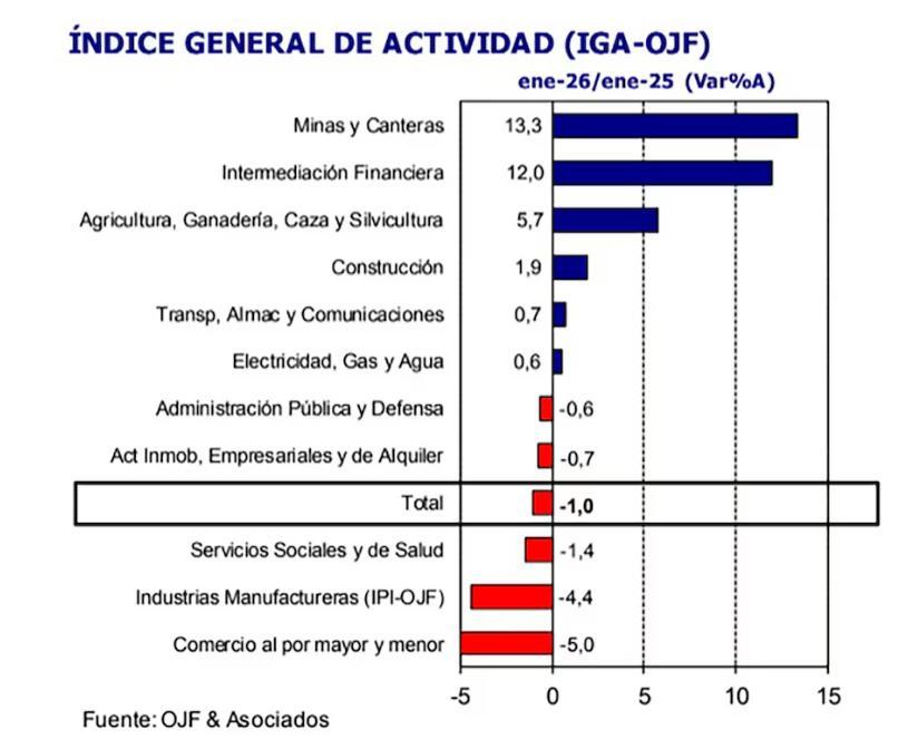 Según el Índice General de Actividad (IGA) de la consultora Orlando Ferreres & Asociados, el nivel general de actividad evidenció una contracción de 1% en la comparación interanual en el primer mes del año. Por el contrario, en términos desestacionalizados, el indicador mostró un incremento de 0,4% frente al mes anterior.