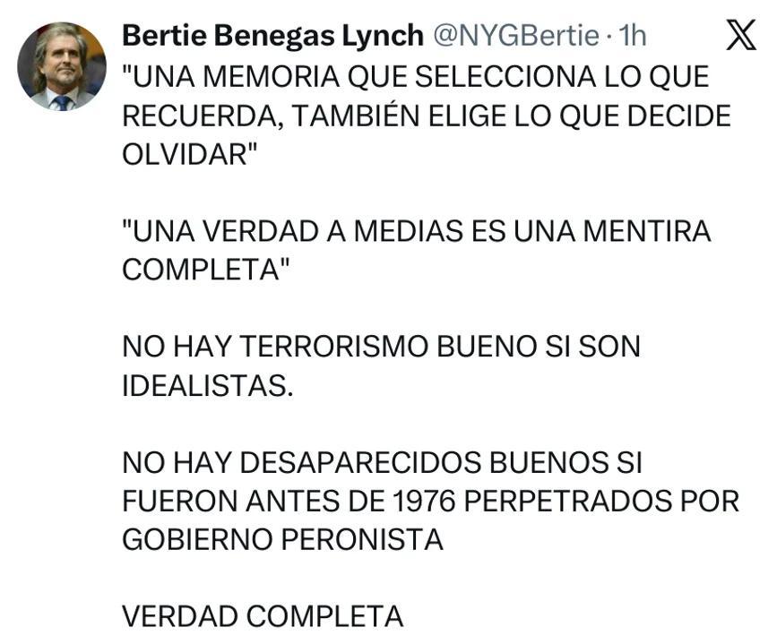 El diputado de La LIbertad Avanza (LLA) Alberto 'Bertie' Benegas Lynch afirmó este martes que "una memoria que selecciona lo que recuerda también elige lo que decide olvidar", al pronunciarse por los 50 años del Golpde Estado de 1976.