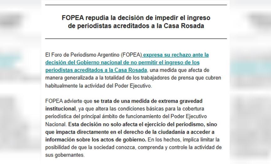 El Foro de Periodismo Argentino (FOPEA) repudió la decisión del Gobierno Nacional de prohibir el ingreso de periodistas a Casa Rosada y aseguró que es una medida de "extrema gravedad institucional".
