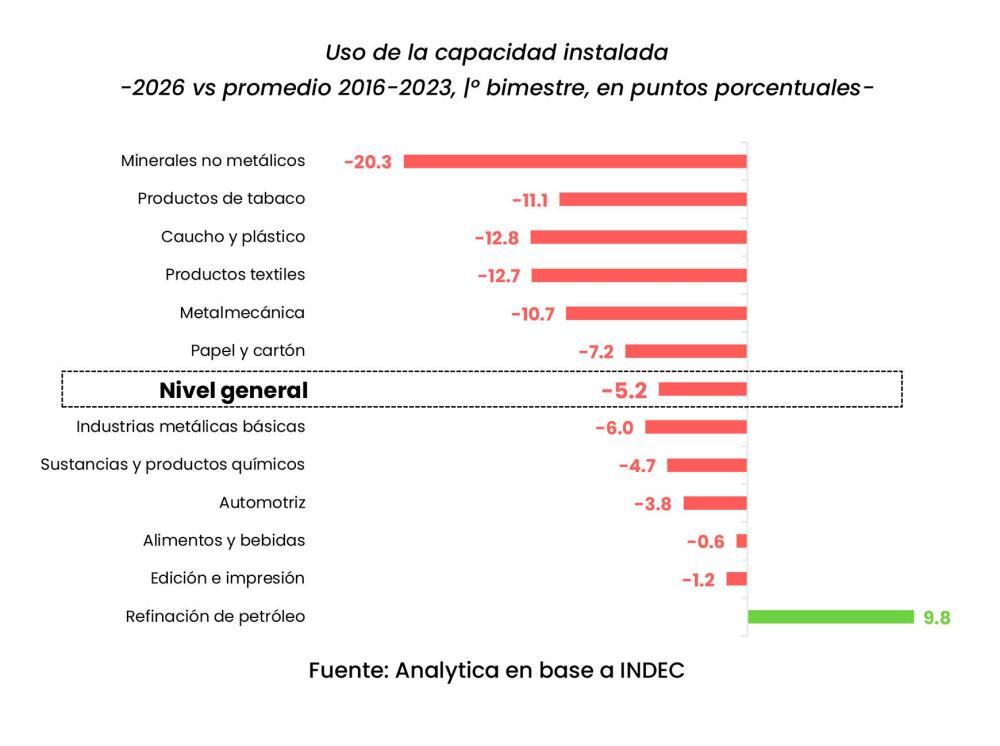 Lorenzo Sigaut Gravina, economista de Equilibra, definió el nivel de utilización fabril como "muy bajo" y subrayó que el 54,6% implica que la industria opera apenas por encima de la mitad de su capacidad. En su análisis, describió una estructura escalonada entre sectores, con refinación de petróleo con niveles cercanos al 90%, luego actividades como papel y cartón y sustancias químicas, con valores en torno a dos tercios de su capacidad; y finalmente industrias metálicas básicas y alimentos, cerca del 60 por ciento.