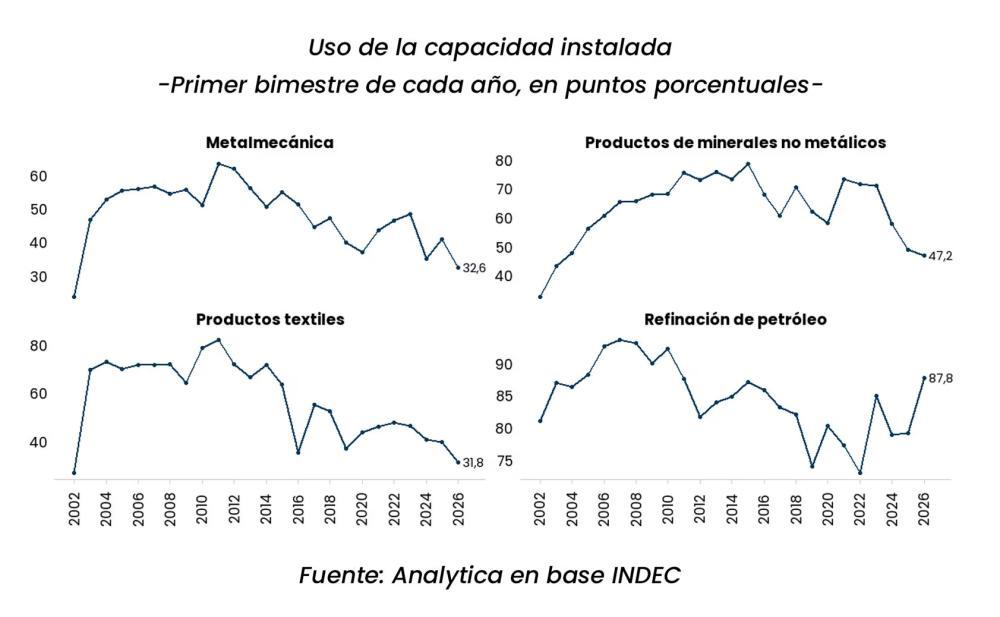 También enfrentan retrocesos los rubros más expuestos a la apertura comercial. El sector de caucho y plástico muestra niveles 64,2% inferiores al promedio 20162023, con fuerte incidencia de la caída en la producción de neumáticos. Los productos textiles se ubican 44% por debajo de ese nivel (el dato de febrero fue 39,9%). En todos estos casos, la utilización de la capacidad instalada marca valores que no se registran desde 2002 o 2003, tras la crisis de la convertibilidad fija entre el peso y el dólar.