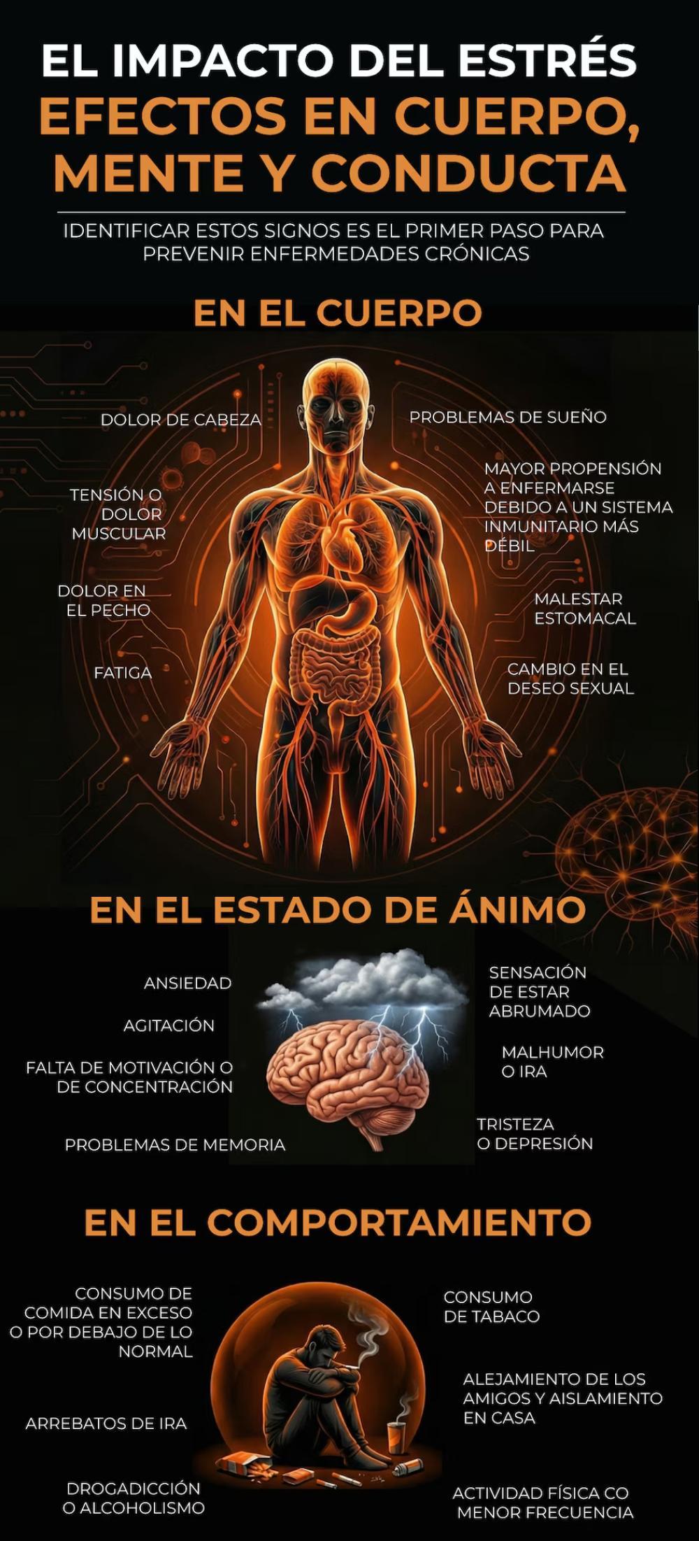 Los síntomas del estrés pueden afectar el cuerpo, los pensamientos y sentimientos, y el comportamiento.