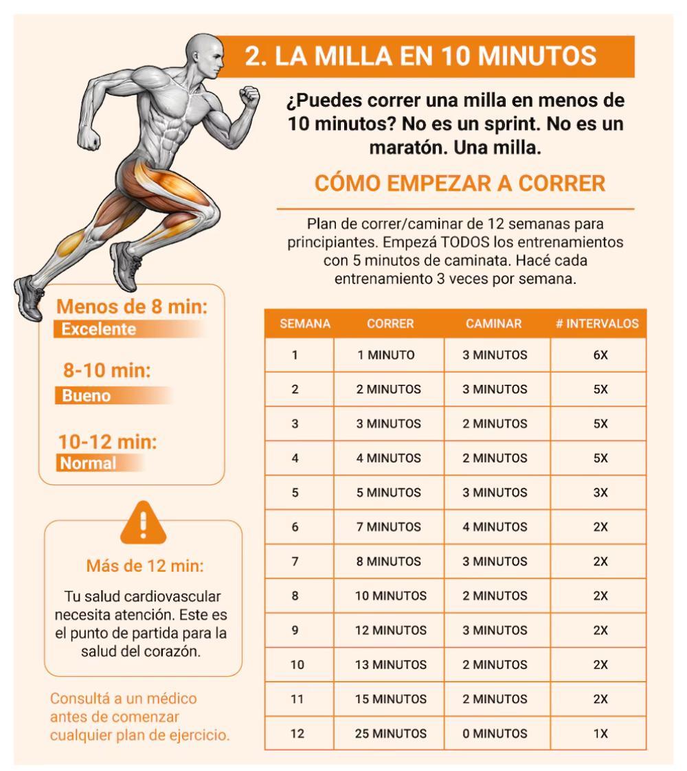 El segundo reto consiste en correr una milla (1,6 kilómetros) en menos de 10 minutos. La prueba evalúa la resistencia básica del corazón y los pulmones. Se recomienda repetirla ocasionalmente para monitorear cambios en la condición física.