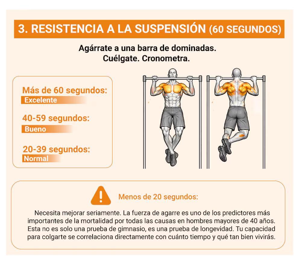 La resistencia a la suspensión consiste en colgarse de una barra y aguantar el propio peso durante al menos 60 segundos. Superar ese tiempo es un indicador de fuerza de agarre sobresaliente y gran capacidad funcional. La fuerza de agarre predice la mortalidad por todas las causas en hombres mayores de 40. Tener un buen agarre se asocia con una mayor longevidad.