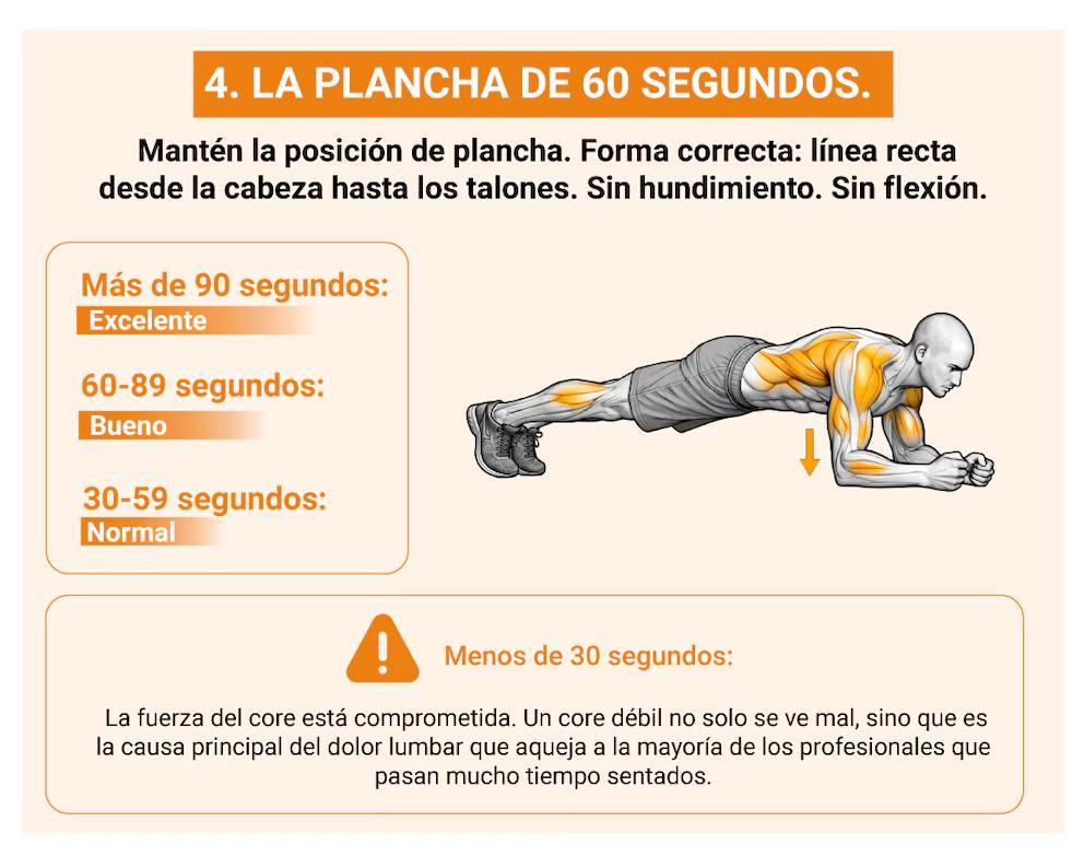 La postura de plancha durante 60 segundos, realizada correctamente con la espalda recta y el abdomen firme, permite evaluar la fuerza del core, que incluye los músculos abdominales, lumbares, oblicuos, la pelvis y los músculos profundos de la espalda. Quienes superan los 90 segundos están en el rango excelente. Un core débil suele relacionarse con dolor lumbar frecuente, sobre todo en quienes pasan muchas horas sentados.