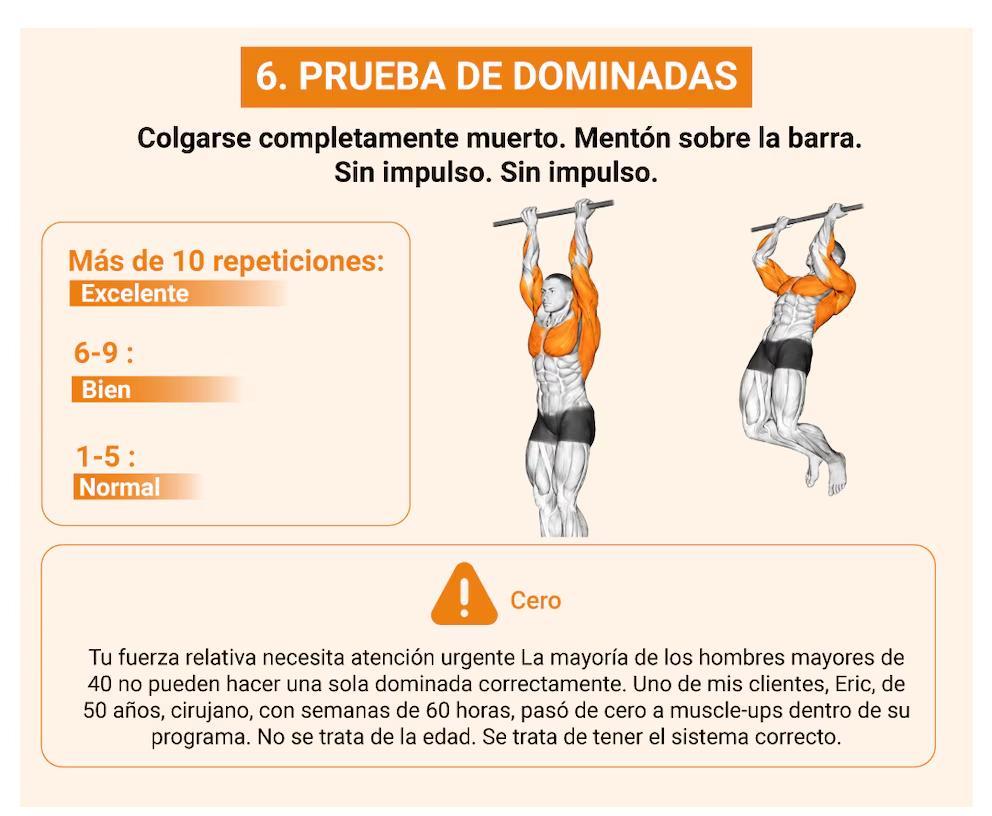 En la prueba de dominadas, el objetivo es elevar el mentón por encima de la barra sin impulso. Realizar más de 10 repeticiones indica una fuerza relativa excelente. No alcanzar ninguna dominada requiere atención urgente, sobre todo porque gran parte de los hombres de más de 40 años falla en esta prueba.
