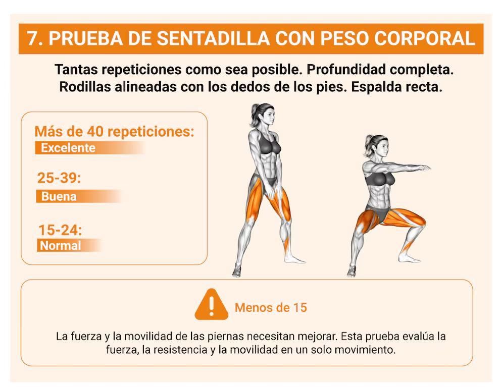La sentadilla con peso corporal evalúa la fuerza y la movilidad de las piernas. Una ejecución correcta espalda recta y rango de movimiento completo ayuda a detectar problemas articulares y debilidades musculares relacionadas con la falta de ejercicio habitual.